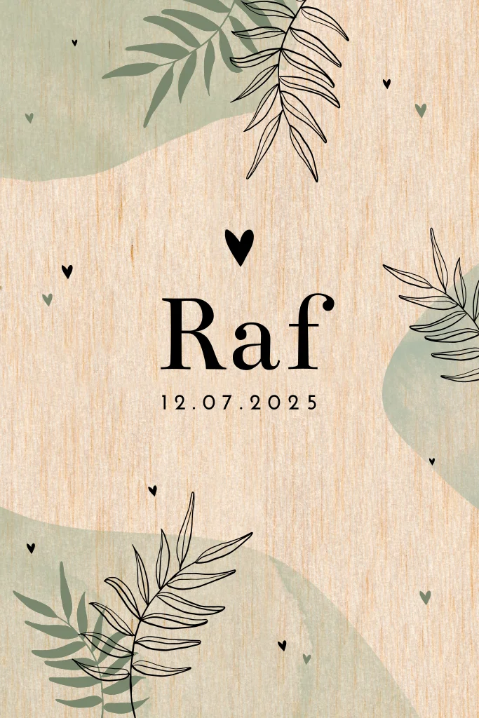 Kondig de geboorte van jullie zoontje aan met dit prachtige écht houten kaartje. Op het kaartje zijn groene watercolour vlakken, kleine hartjes en lijntekeningen van takjes te zien. Bestel snel een proefdruk om dit kaartje in het echt te bewonderen!