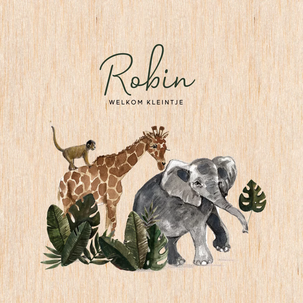 Wat een leuk junglekaartje! Op dit babykaartje staan handgetekende illustraties van dieren zoals een giraffe, olifant en een aapje.