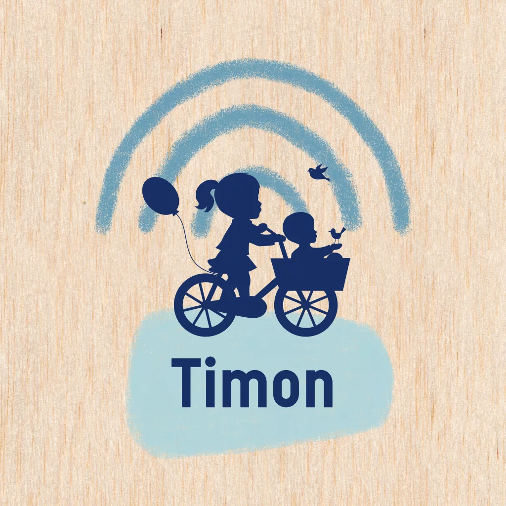Een hip houten geboortekaartje met silhouetten van jongetje met zijn grote zus op de fiets en een regenboog op de achtergrond. Pas zelf eenvoudig de kleuren aan. Meerdere afbeeldingen beschikbaar voor een andere gezinssituatie.