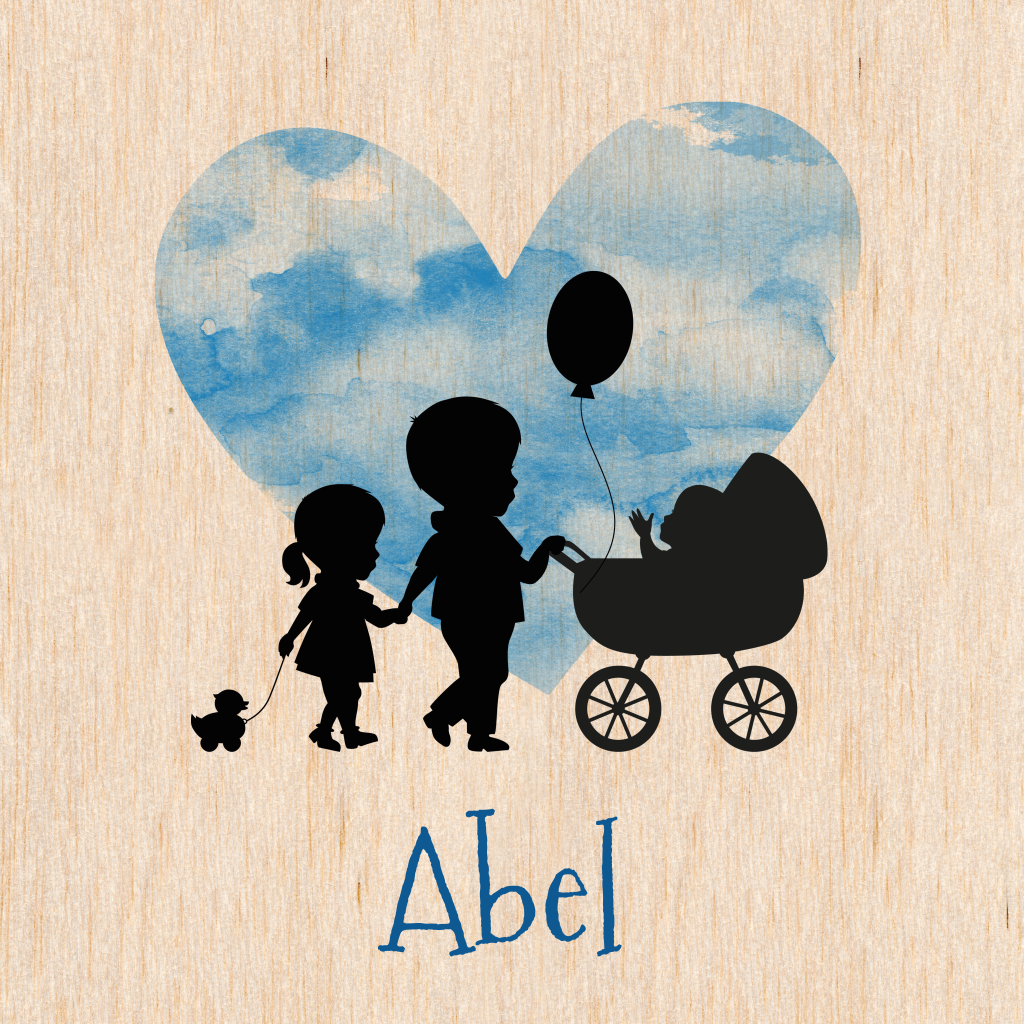Echt houten geboortekaartje broertje met silhouetjes en aquarel hartje
