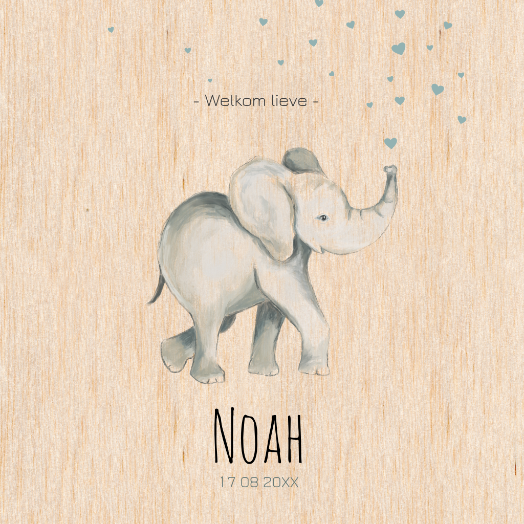 Lief houten babykaartje met een hand getekend olifantje die hartjes de lucht in blaast. De ronde hoekjes van dit kaartje zijn een luxe afwerking.