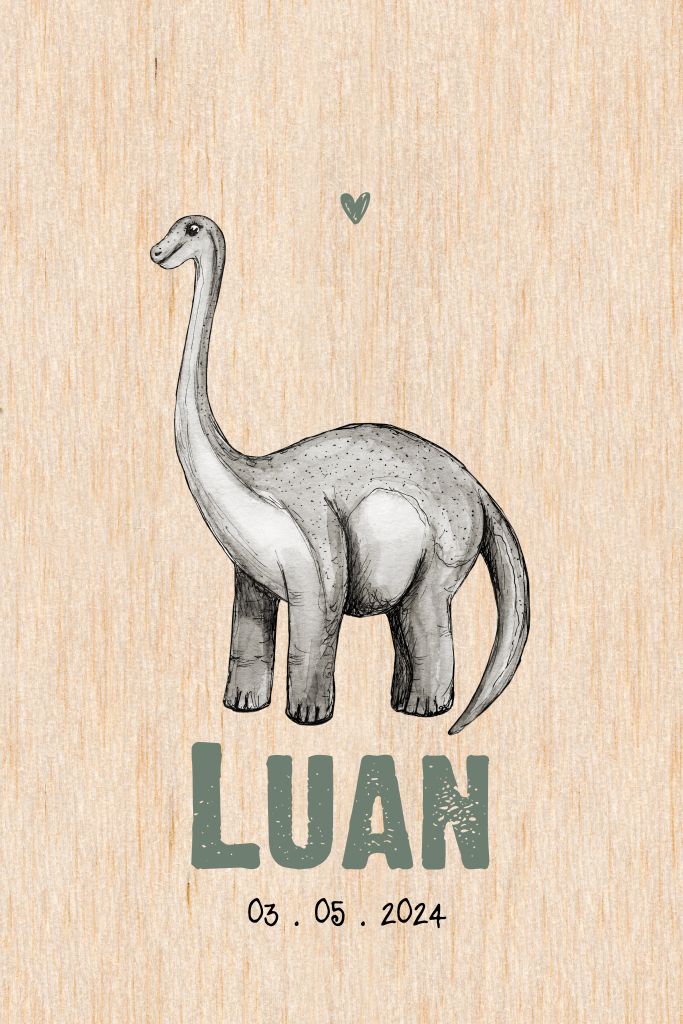 Stoer geboortekaartje met dino en stoere typografie. Dit kaartje wordt gedrukt op echt hout en maakt het kaartje extra stoer! Pas de teksten en kleuren eenvoudig aan en maak zo je eigen unieke kaartje!
