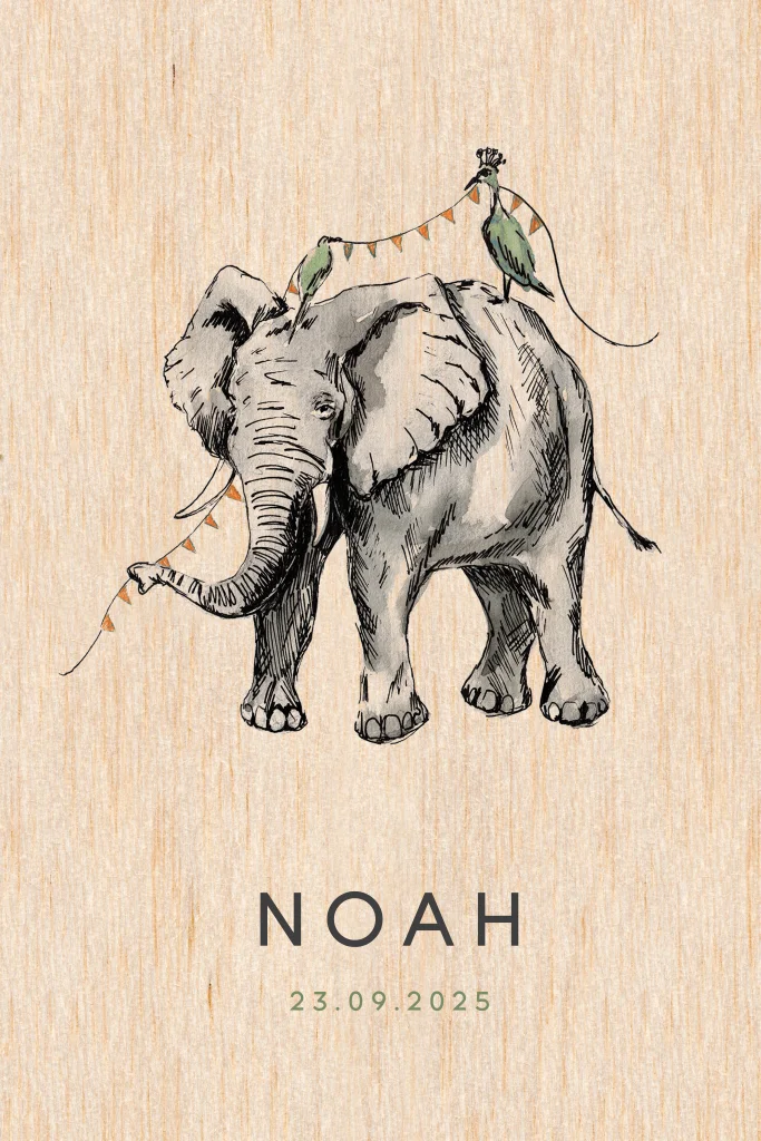 Op dit mooie babykaartje staat een pentekening van een olifant met op zijn rug twee groene vogels die een oranje vlaggenlijn vasthouden. Dit unieke kaartje wordt gedrukt op echt hout!