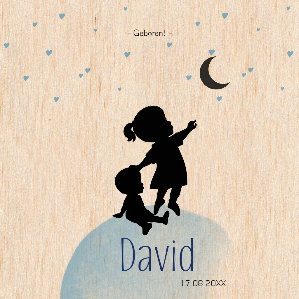 Lief houten geboortekaartje met het silhouet van een grote zus met haar klein broertje op een waterverf wereldbol. Op de achtergrond staan een maantje en lieve blauwe hartjes. Wist je dat je dit kaartje nog helemaal naar wens aan kunt passen in de online editor?