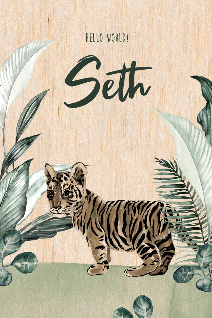 Een hip, echt houten geboortekaartje voor een jongen met groene takjes en een kleine tijger.Dit product maakt onderdeel uit van deze set.