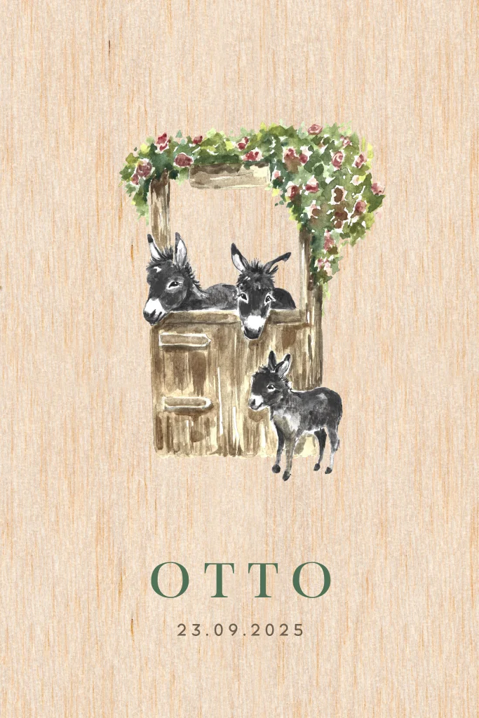 Op dit schattige kaartje voor de geboorte van jullie zoontje staat de tekening van drie ezeltjes. Het kaartje wordt gedrukt op echt hout en heeft ronde hoeken. Bestel snel een proefdruk om het kaartje in het echt te bewonderen!