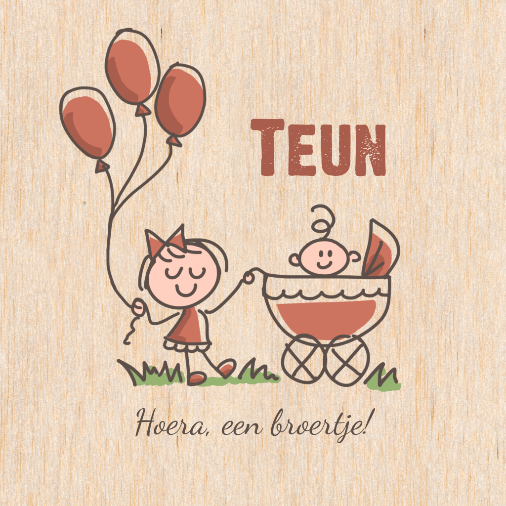 Dit is een lief kaartje voor de geboorte van jullie zoontje en broertje. Op het kaartje is de illustratie van een grote zus die met de kinderwagen loopt te zien. De ballonnen maken dit kaartje extra feestelijk. Pas het kaartje aan in onze online editor en bestel een proefdruk om dit kaartje in het echt te zien!