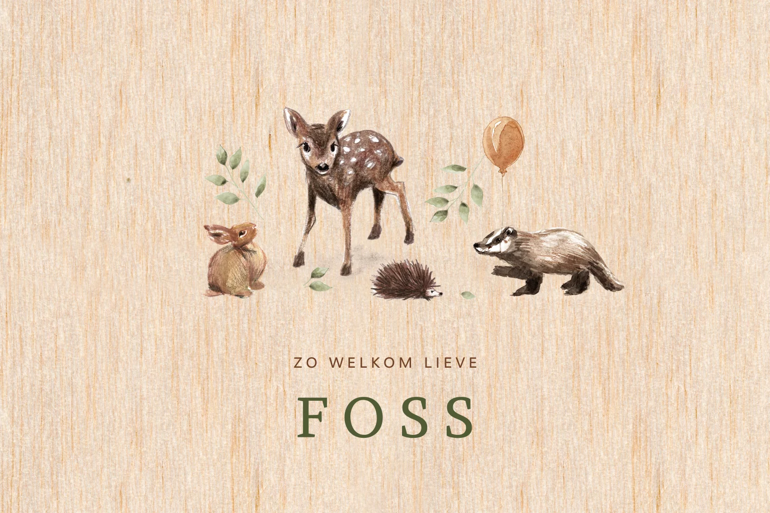 Dit kaartje is gemaakt van écht hout. Op het kaartje staan de tekeningen van verschillende bosdieren. De ronde hoeken maken dit kaartje helemaal compleet.
