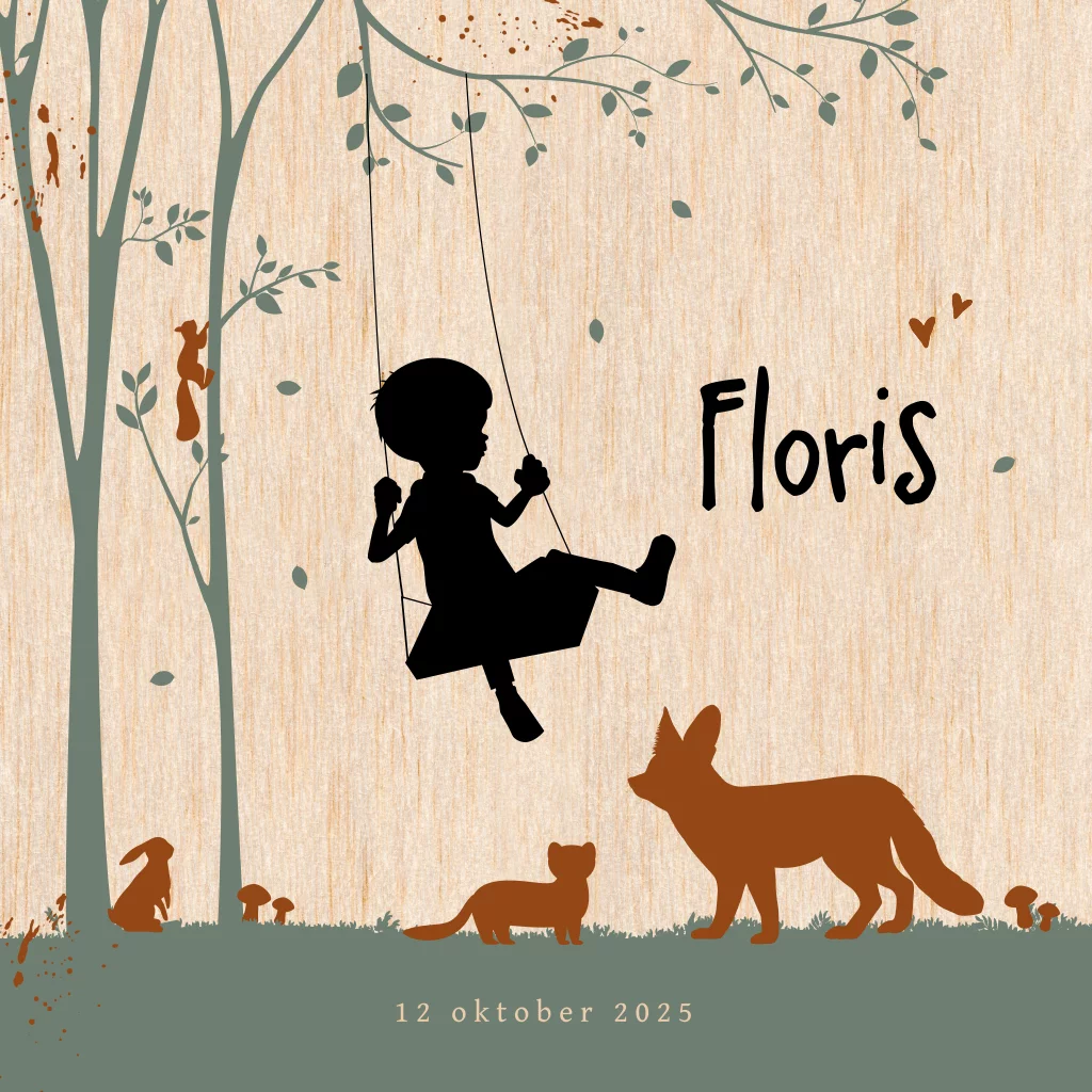 Een hip geboortekaartje voor een jongen van echt hout! Op deze kaart staat de silhouet van een kindje op de schommel met een boom en bosdieren in blauwe en bruine tinten.