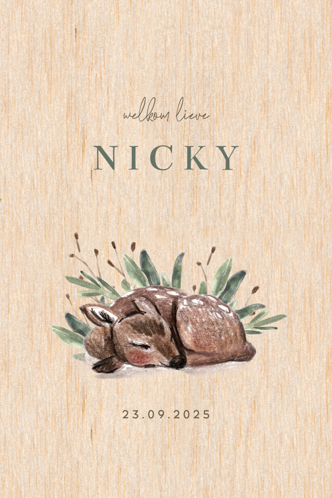 Dit schattige kaartje wordt gedrukt op echt hout. De tekening van het slapende hertje en de groene typografie sluiten mooi bij elkaar aan. De ronde hoeken maken dit kaartje helemaal af. Bestel snel een proefdruk om dit kaartje in het echt te zien!