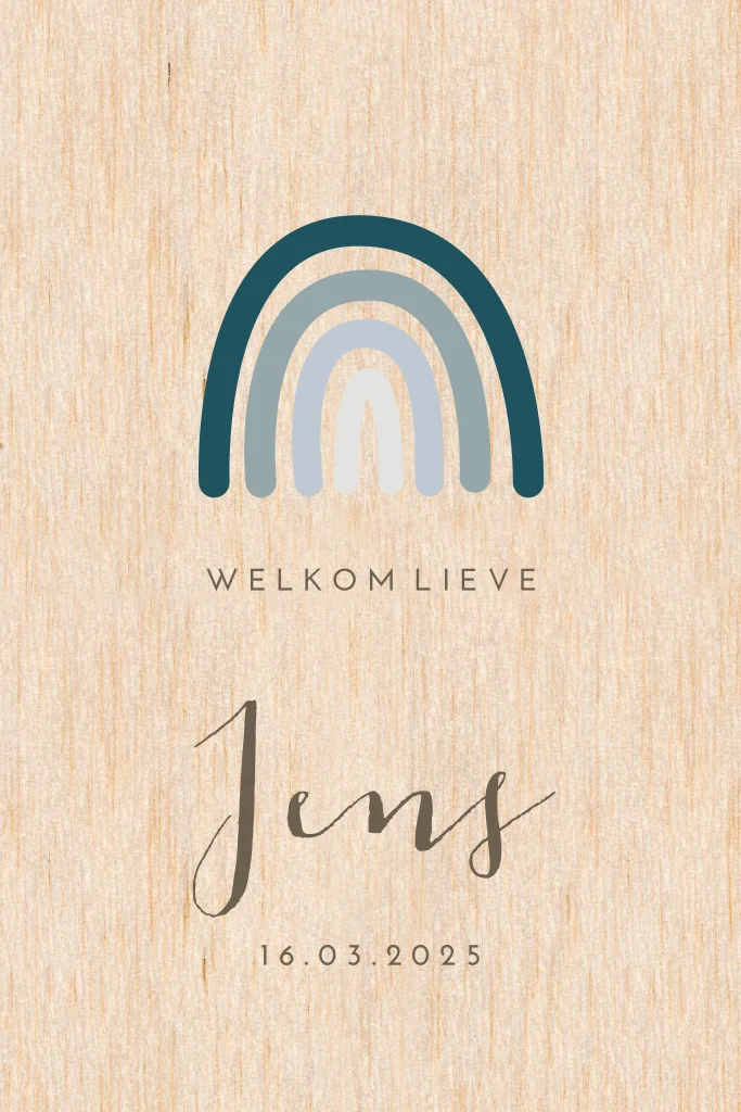 Trendy geboortekaartje op echt hout met blauw regeboogje-jongen