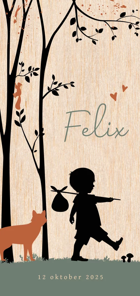 Een hip geboortekaartje voor een jongen van echt hout! Op deze kaart staat een silhouet van een kindje en een vos onder een boom. Bij de naam staan lieve hartjes. Dit ontwerp kan worden aangepast in de online editor.