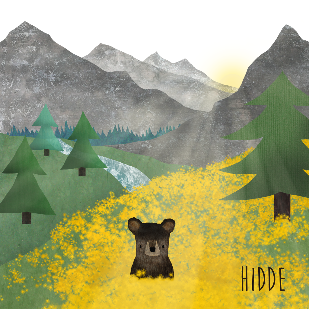 Prachtig echt houten geboortekaartje met een illustratie van een beertje tussen de gele bloemen in een berglandschap met opkomende zon. Uniek en mooi! Leuk voor de geboorte-aankondiging van een jongen. Maak hem compleet met een bijpassende envelop!