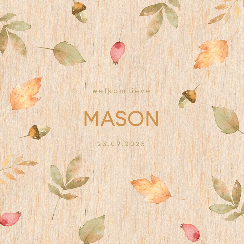 Hip houten geboortekaartje met eikels en herfstblaadjes in de kleuren groen, geel en rood. Dit kaartje wordt gedrukt op echt hout, wat goed past bij het herfst thema.