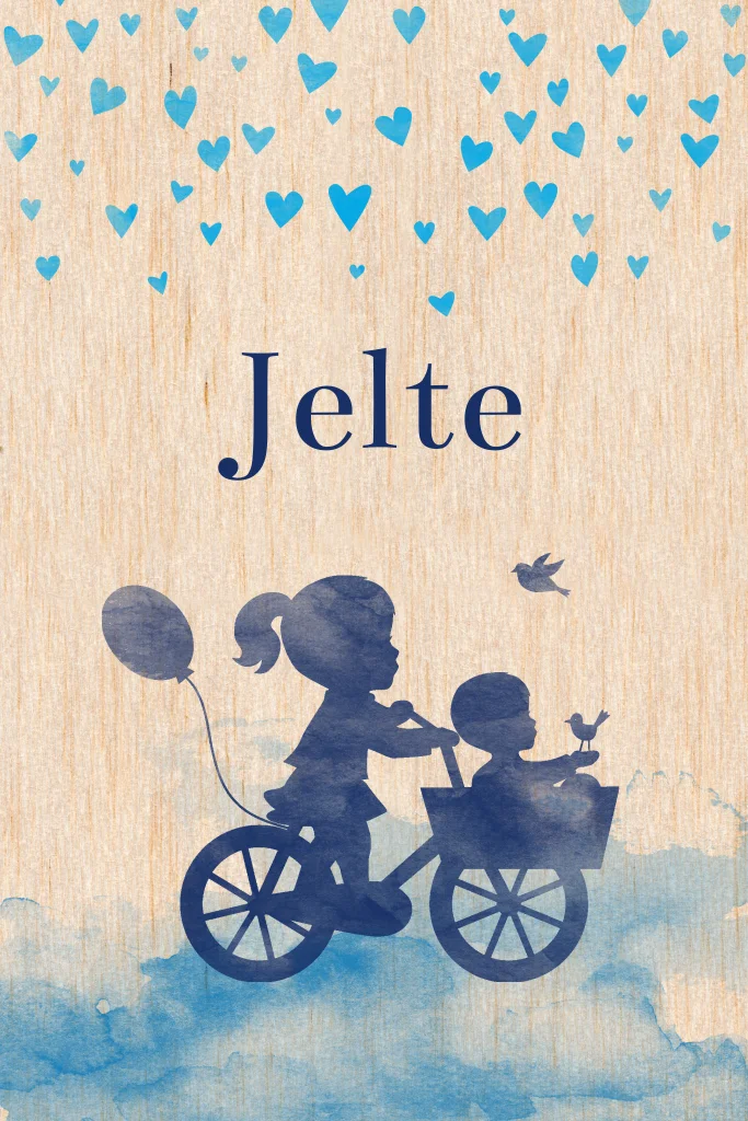 Een houten geboortekaartje met confetti van waterverf hartjes en een waterverf silhouet van een jongetje met z'n grote zus op de fiets.