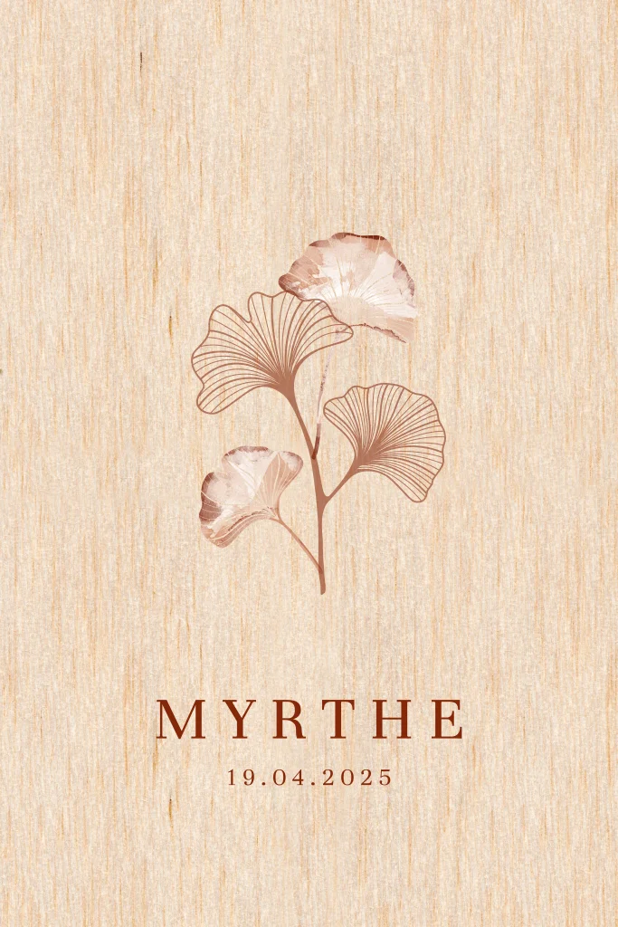 Op dit unieke geboortekaartje staat een tekening van een takje met bloemetjes en de naam van jullie kindje. Het kaartje heeft een mooi minimalistisch ontwerp en omdat het op hout gedrukt wordt ook een heel natuurlijke uitstraling. Bewerk dit kaartje helemaal naar wens in de online editor.