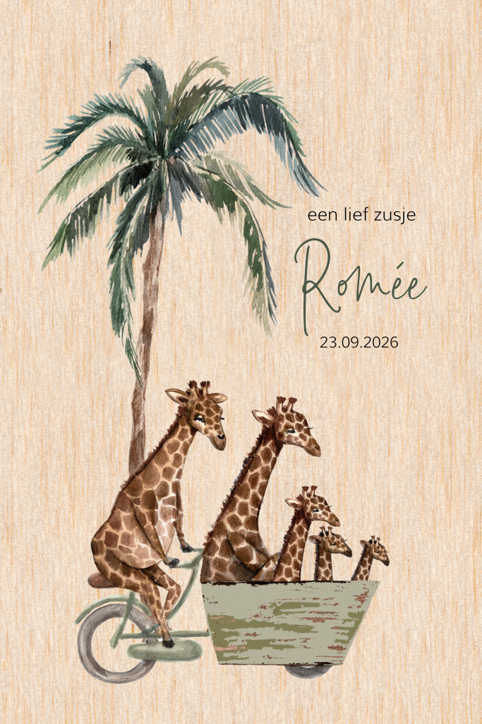 Een avontuurlijk geboortekaartje voor jullie derde kindje. De gehele giraffen familie zit in de bakfiets, wat een gezellige boel! Dit ontwerp wordt gedrukt op echt berkenhout. Ontzettend uniek!Totaalprijs: 0 |