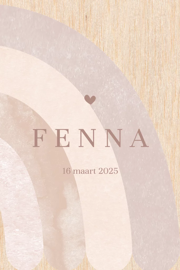 Geboortekaartje op echt hout met roze regenboogje en hartje