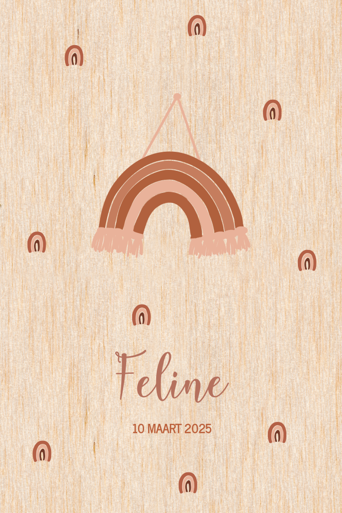 Dit hippe geboortekaartje met kleine regenboogjes en een bohemian hanger van een regenboog wordt gedrukt op echt hout! Ook heeft dit exemplaar nog eens ronde hoeken, wat het extra speciaal maakt. Perfect voor de geboorte van jullie kleine meid!