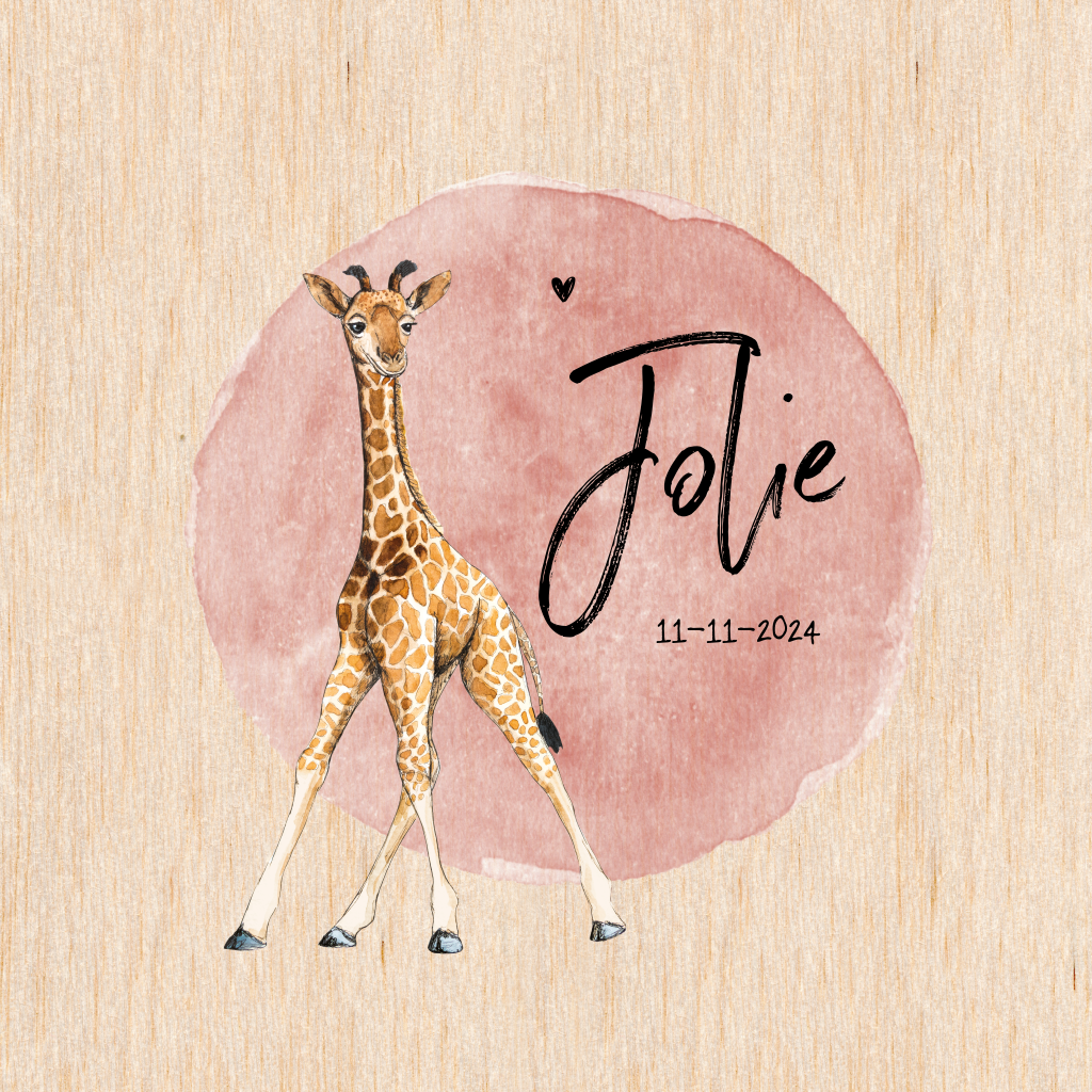 Lief girafje met de hand getekend en daarna met aquarel geschilderd. Dit kaartje van echt hout is perfect voor de geboorte van jullie dochtertje. Maak er, met de juiste kleuren en lettertypes, je eigen ontwerp van.