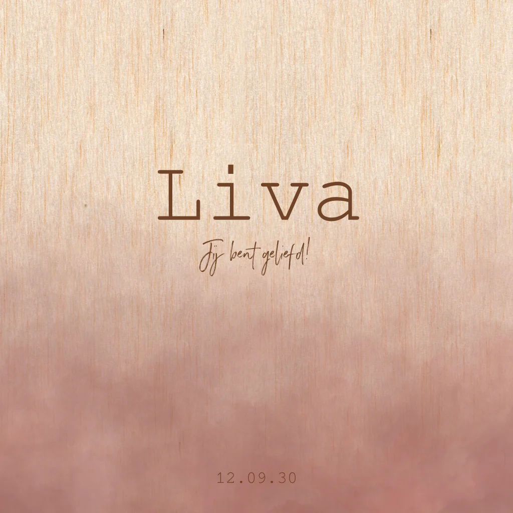 Origineel kaartje voor jullie dochtertje. Dit hippe design wordt gedrukt op echt hout en heeft daarnaast ook nog eens mooie ronde hoeken. De watercolour aan de onderkant in het roze is erg lief. De aandacht gaat meteen naar de naam in het originele lettertype.