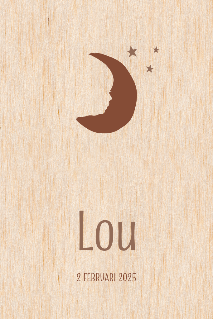 Trendy babykaartje van echt hout met het silhouet van een babygezicht in maan en bruine sterretjes.