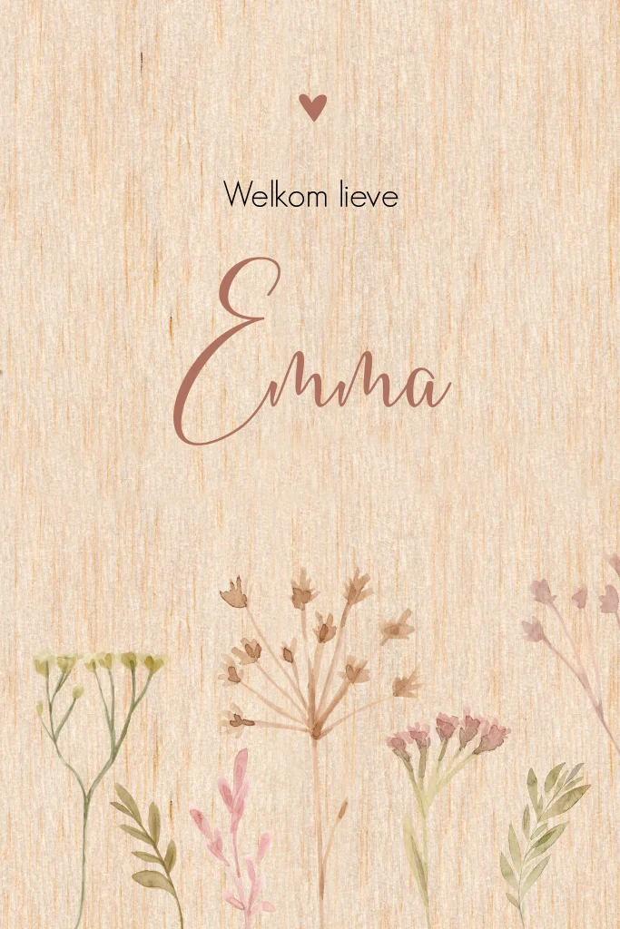 Babykaartje op echt hout met droogbloemetjes van waterverf