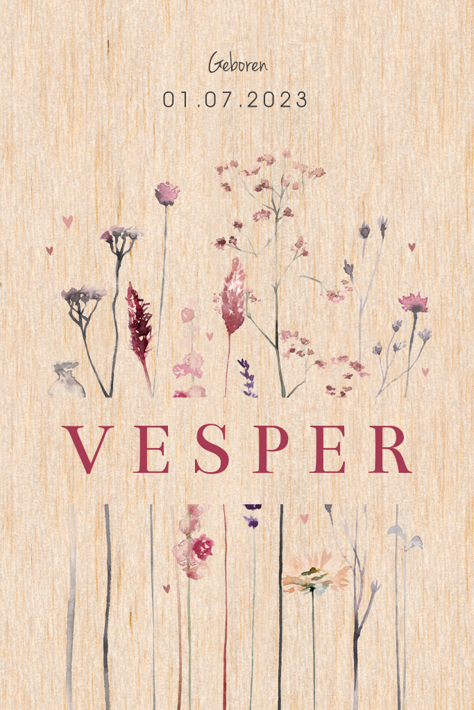 Een unieke kaart voor de geboorte van jullie dochter. Deze kaart is niet alleen van echt hout gemaakt, maar heeft ook nog eens mooie ronde hoeken. Unieker kan niet! Er zijn verschillende droogbloemen op dit geboortekaartje te zien.