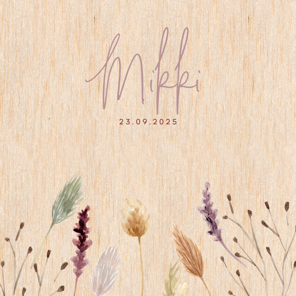 Trendy geboortekaartje voor meisje op hout met gedroogde bloemen