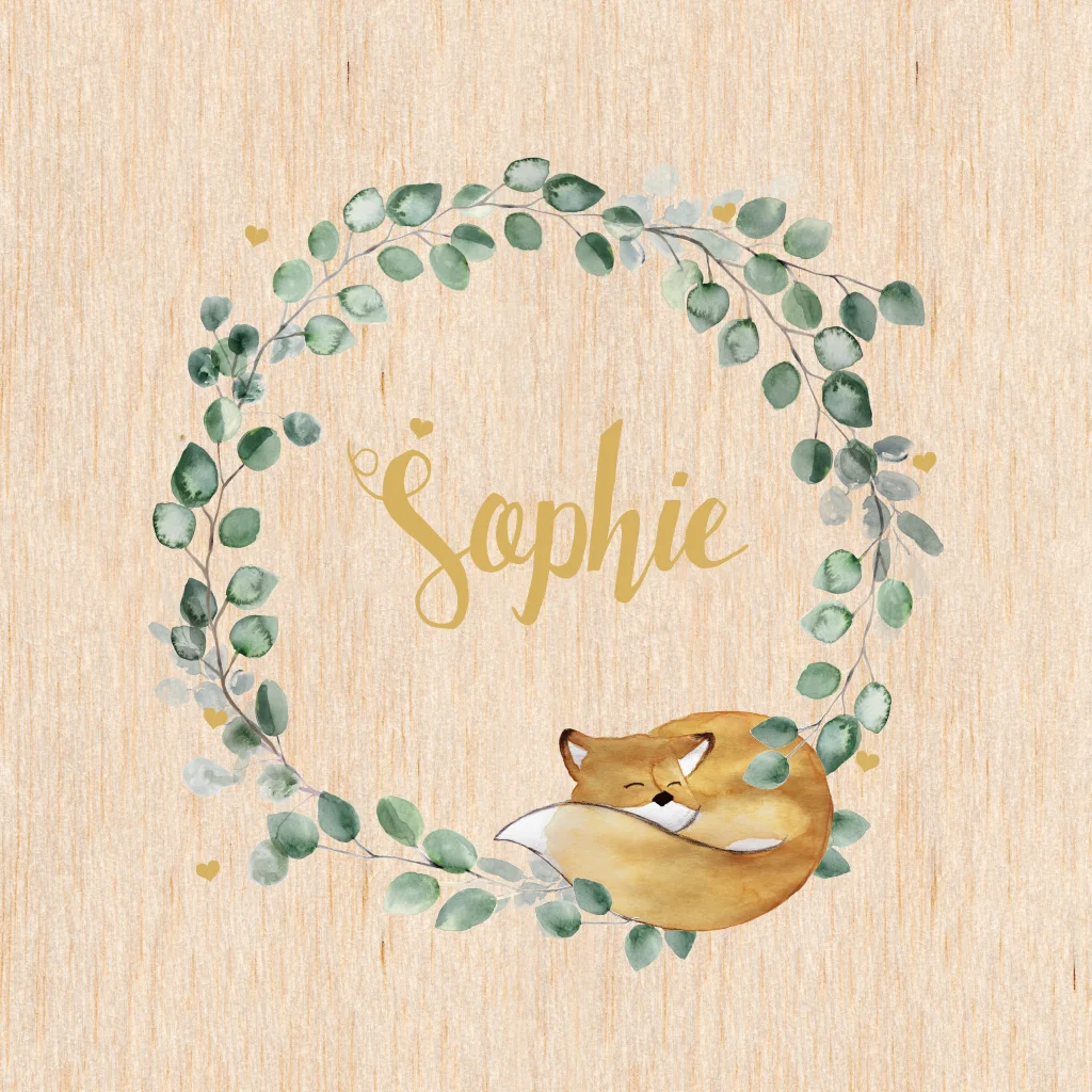 Trendy geboortekaartje met een waterverf eucalyptus krans en een lief slapend vosje. Het kaartje wordt gedrukt op echt hout, wat het extra uniek maakt!