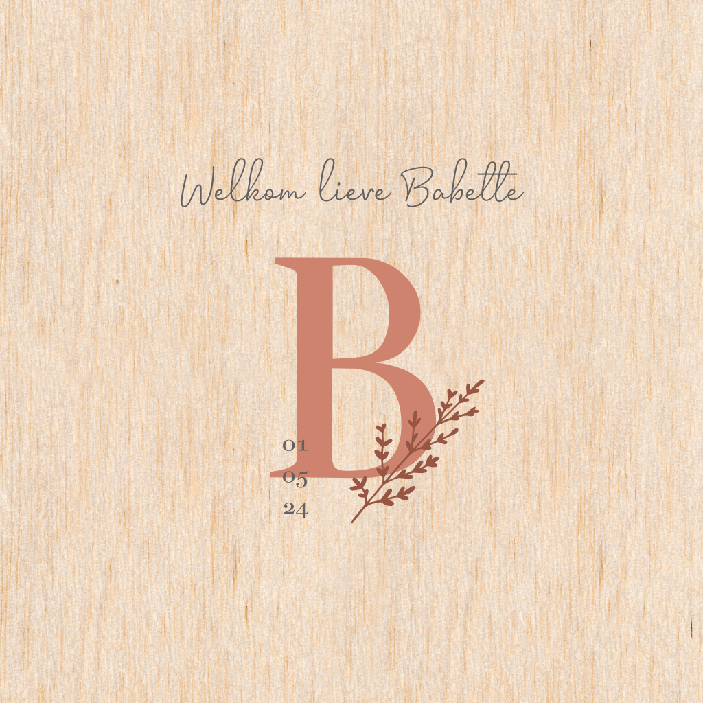 Dit houten kaartje is eenvoudig te personaliseren met de letter van jouw eigen kindje. Ook de kleuren zijn naar eigen wens aan te passen. Een stijlvol geboortekaartje met botanische details.