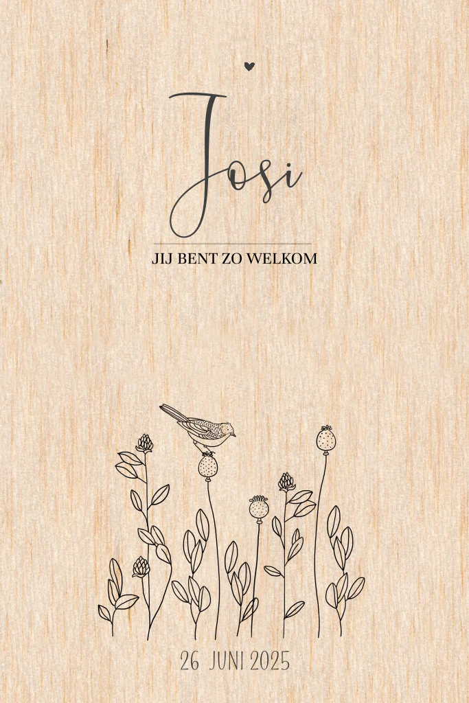 Trendy natuurlijk geboortekaartje van hout voor je pasgeboren dochtertje met een mooie lijntekening van droogbloemen en een vogeltje. Dit kaartje is gemaakt van echt hout en is dus heel hip!