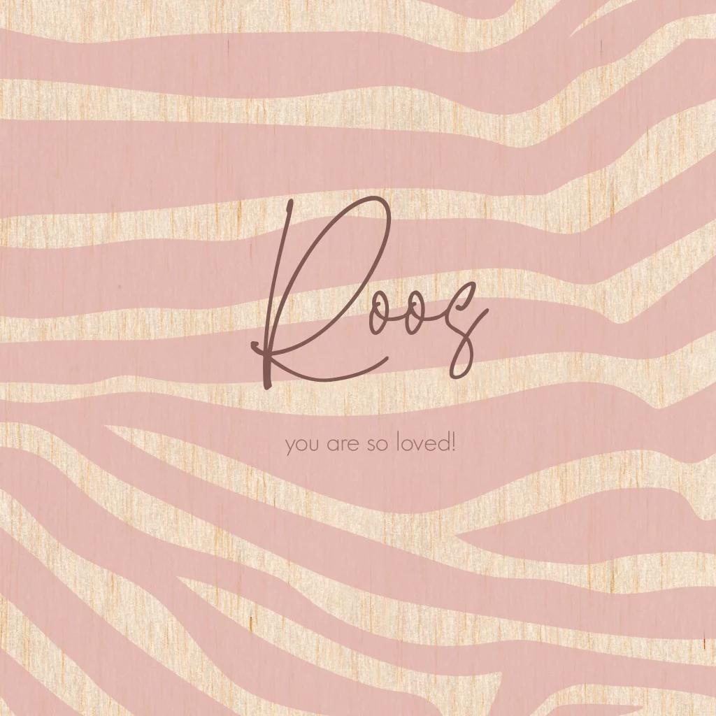 Dit stoere babykaartje wordt gedrukt op echt hout! Op het kaartje staat een patroon van roze zebra strepen en de naam van jullie dochter in mooie letters. Pas de teksten op dit kaartje eenvoudig aan in de online editor.