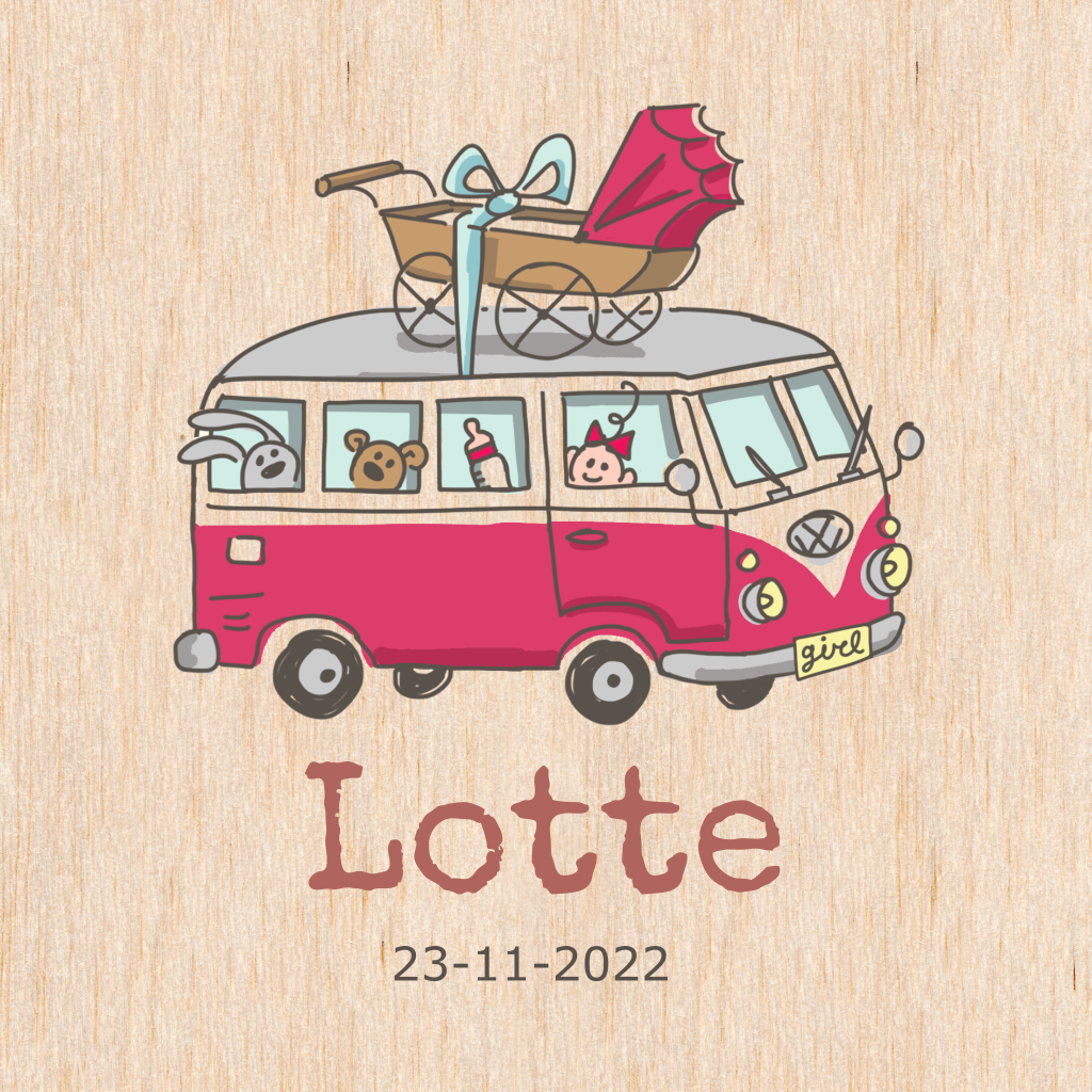 Echt houten geboortekaartje met een vrolijke illustratie van een vintage volkswagen busje met daarin een meisje en haar knuffels. Bovenop het dak staat haar kinderwagen. Op de nummerplaat het woord girl.