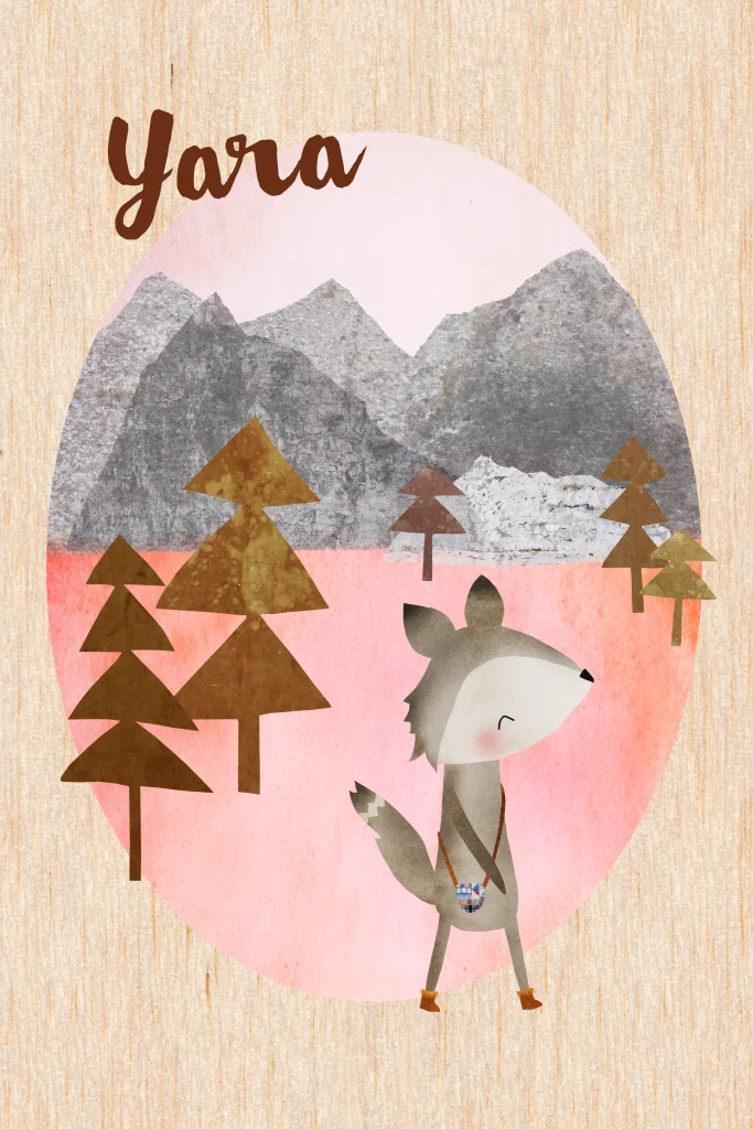 Houten geboortekaart voor een meisje met een vos in de bergen