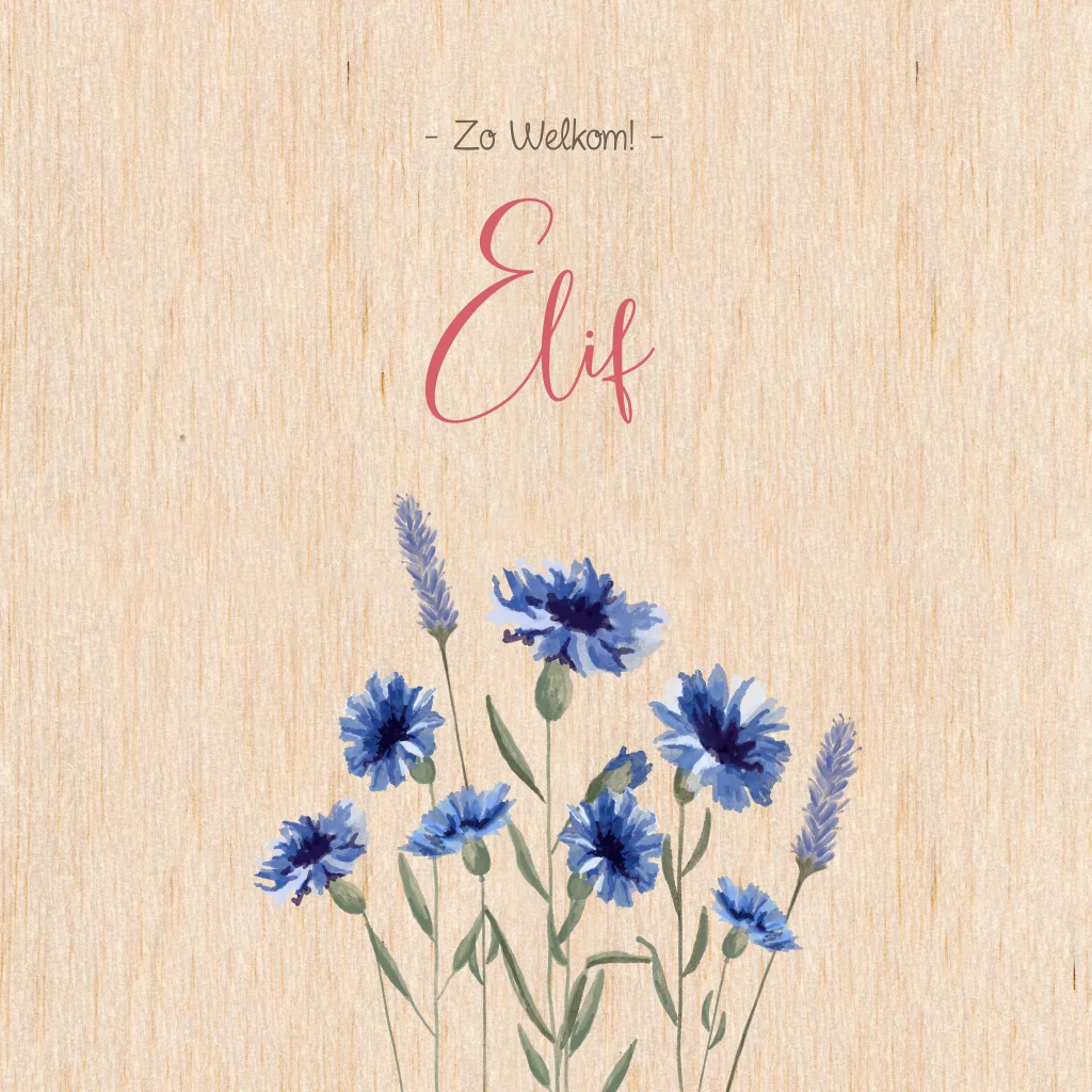 Dit hippe geboortekaartje met ronde hoeken en geschilderde bloemen in blauwe kleuren wordt gedrukt op echt hout. Pas de teksten op dit kaartje naar wens aan in de online editor.
