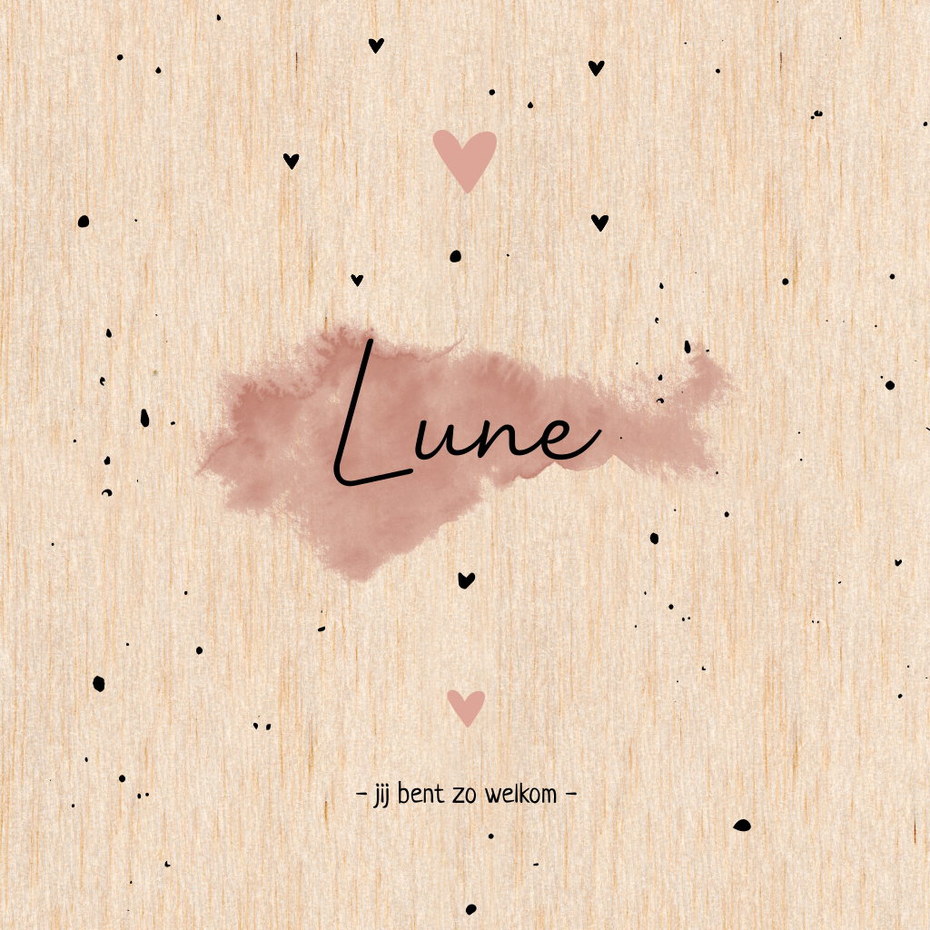 Echt houten geboortekaartje meisje met waterverf en spatten