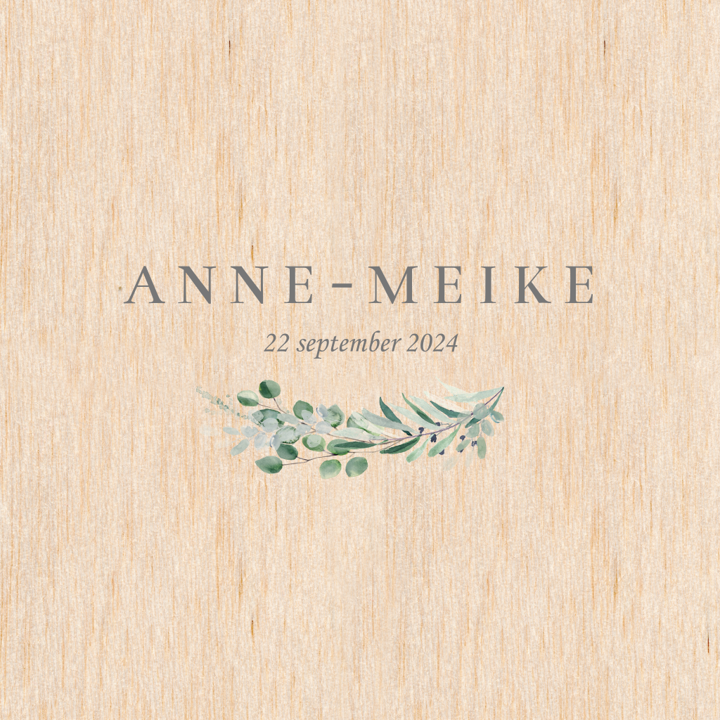 Echt houten geboortekaartje met ronde hoeken en eucalyptus takje