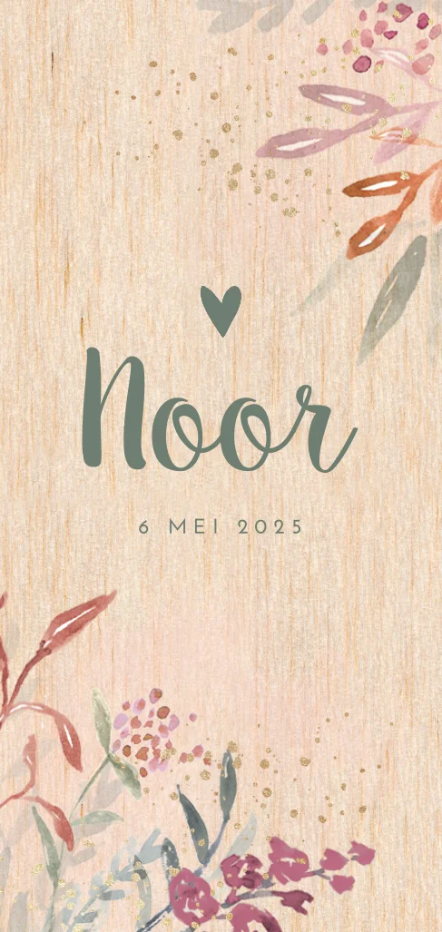 Hip geboortekaartje met watercolour blaadjes in warme natuurlijke tinten. De babynaam en het hartje in goudlook maken dit echt een trendy geboortekaartje! Doordat het ontwerp op echt hout wordt gedrukt, is dit kaartje zo uniek!