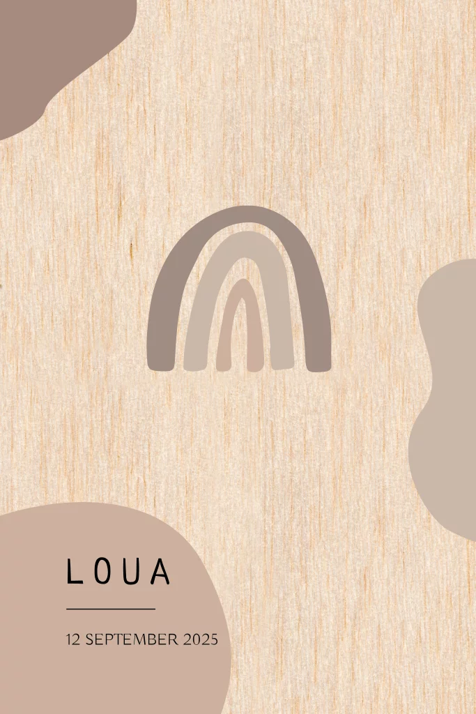 Een hip echt houten geboortekaartje met regenboogje en abstracte vormen in natuurlijke bruine tinten.