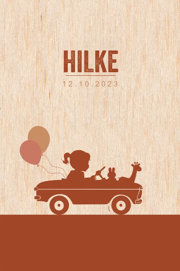 Echt houten geboortekaartje voor meisje met retro auto en ballon