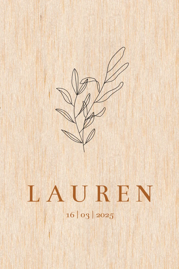 Minimalistisch geboortekaartje voor de geboorte van je dochtertje. De pentekening van een takje en de naam in het krachtige lettertype, maken deze kaart heel hip. Het gave ontwerp wordt gedrukt op echt hout.