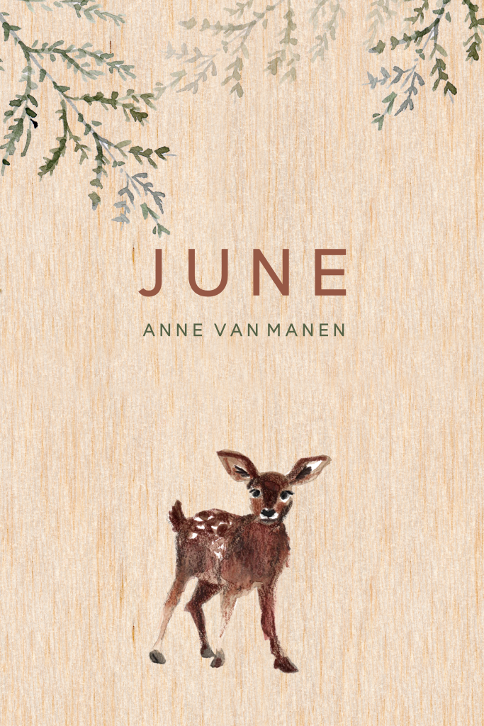 Dit babykaartje wordt gedrukt op echt hout. Op de voorkant van het kaartje staan de tekening van een hertje en groene takjes in aquarel. Pas de teksten gemakkelijk aan in de online editor.