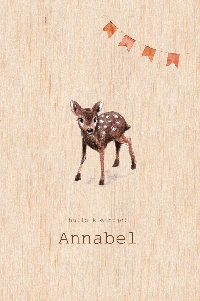 Geboortekaartje van echt hout met een illustratie van een getekend hertje en vrolijke oranje vlaggetjes. Leuk kaartje voor een kindje dat in de herfst geboren wordt. Origineel vanwege de ronde hoeken en het echte hout.