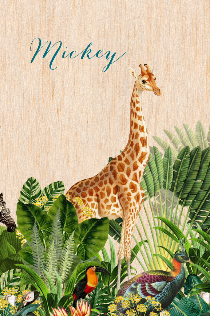 Wat een origineel geboortekaartje voor jullie kleintje! Dit kaartje is van echt hout gemaakt en dus altijd uniek. Er is een giraf te zien en verschillende andere dieren uit de jungle. De botanische elementen maken het echt een geheel.