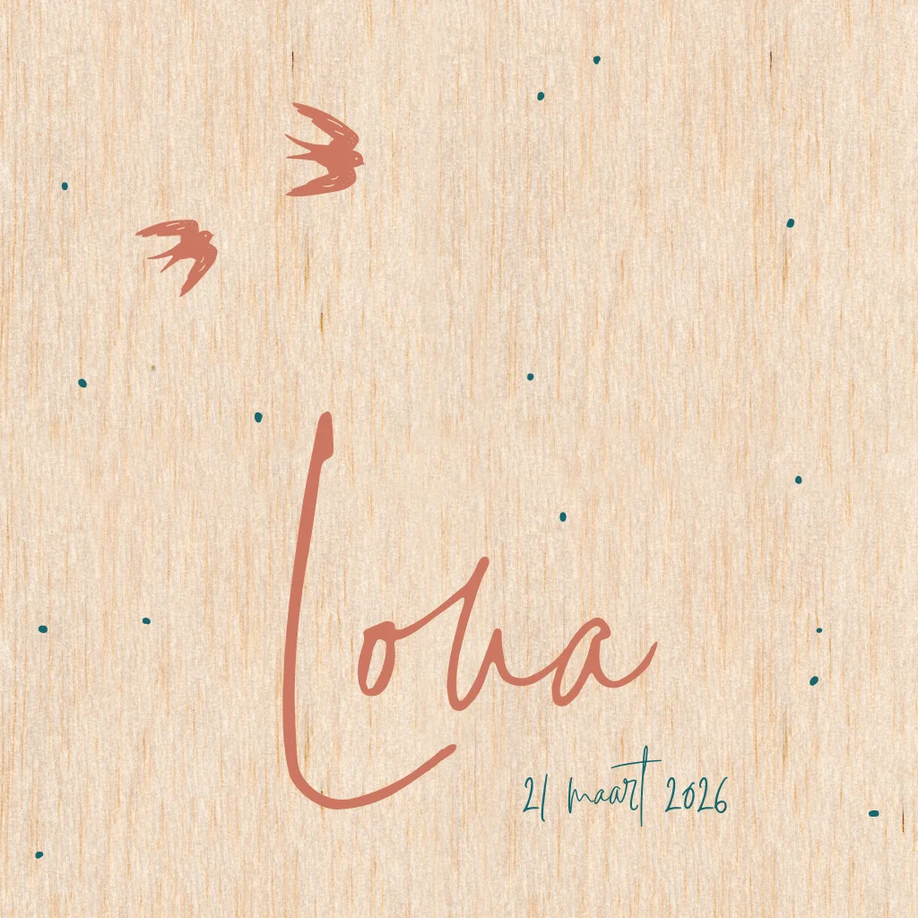 Dit hippe houten kaartje met zwaluwen en vrolijke stippen heeft een mooi eenvoudig ontwerp. Het kaartje is uitgevoerd in trendy roestbruin en petrol. Pas zelf eenvoudig de kleuren en teksten van het kaartje aan in de online editor.