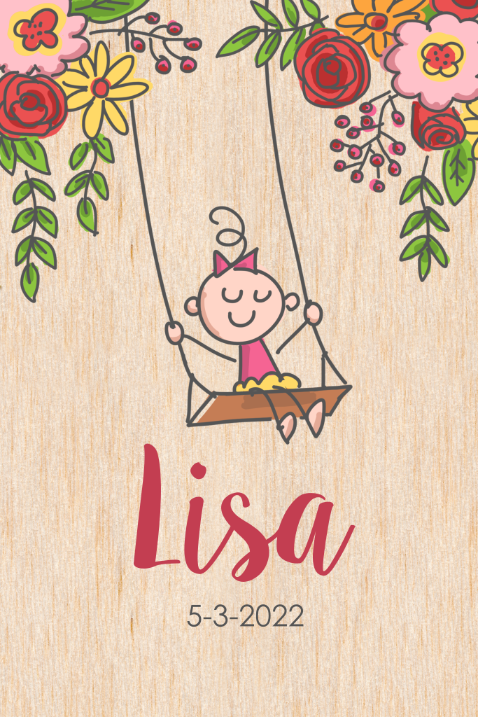 Lief geboortekaartje voor een dochter. Een meisje zit op een schommel. Ze draagt een roze jurk en strik. Boven haar hoofd allerlei bloemen in vrolijke kleuren. Ook op de achterkant een bloem en een tak zoals een roos, margriet, viooltje, bessentak en groene blaadjes.