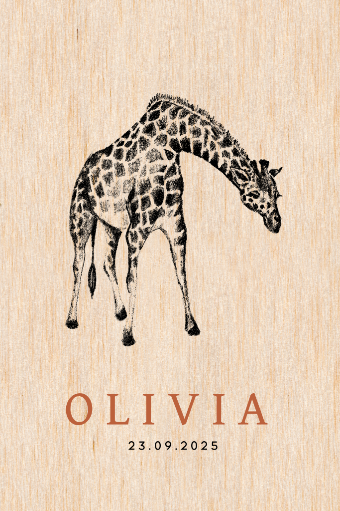 Uniek handgetekend babykaartje van echt hout. Op het kaartje staat de illustratie van een giraffe met een gebogen nek. Op de achterkant staat een klein girafje. De kleur van de tekeningen kun je naar wens aanpassen in de online editor.
