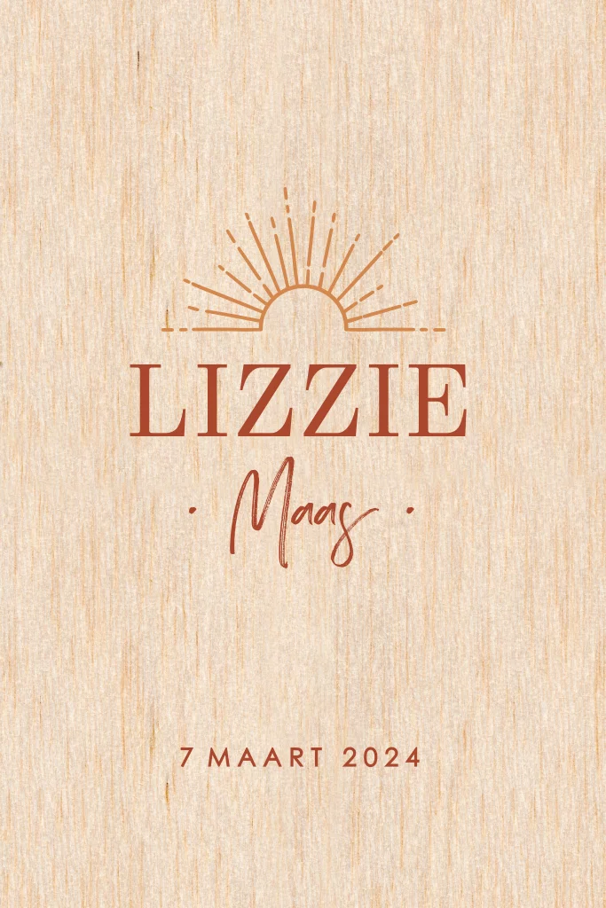 Hip babykaartje met de illustratie van een opkomende of ondergaande zon in oranje. Pas de teksten en kleuren op dit kaartje naar wens aan in de online editor.