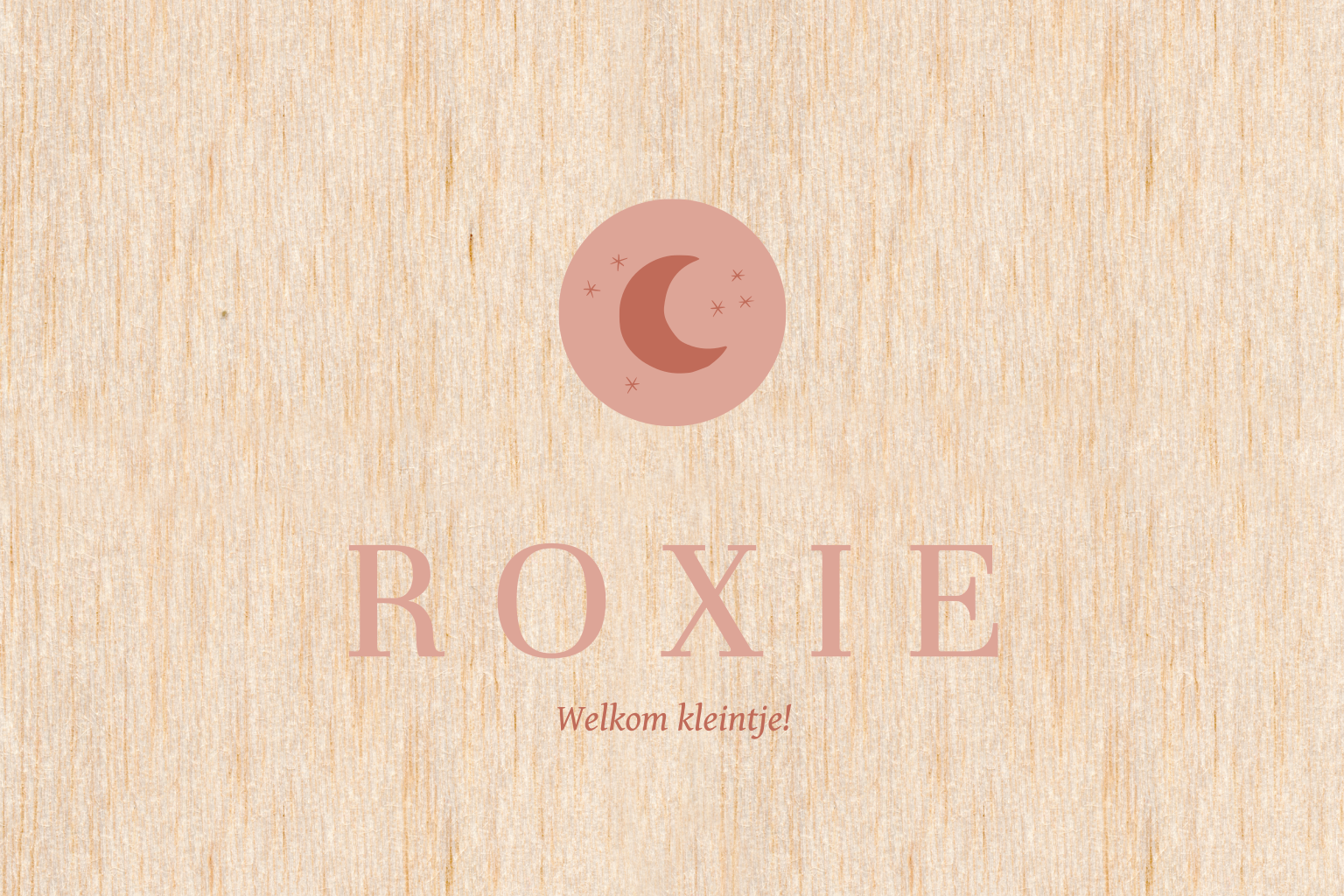 Dit is een bijzonder geboortekaartje! Dit komt doordat het kaartje van echt hout is. Dit geeft het een extra bijzondere look & feel. Leuk met het ontwerp van een roze halve maan in een roze cirkel. De naam staat in een hip lettertype. Je kan de naam zelf veranderen in onze online ontwerptool.